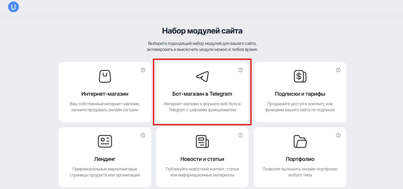 1. Перейдите в конструктор uCoz, зарегистрируйтесь и создайте сайт, обязательно активировав при создании модуль “Бот-магазин в Telegram”