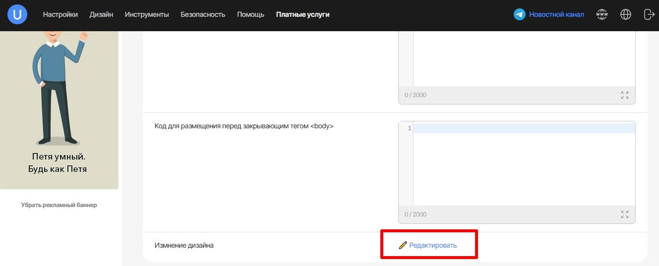 Код - возможность стилизовать бота CSS-кодом, добавить дополнительные блоки при помощи JS, а также подключить необходимые файлы из Файлового менеджера.Для CSS-кода более 2000 символов (включая пробелы) используйте кнопку Редактировать, чтобы перейти в таблицу CSS без лимита.