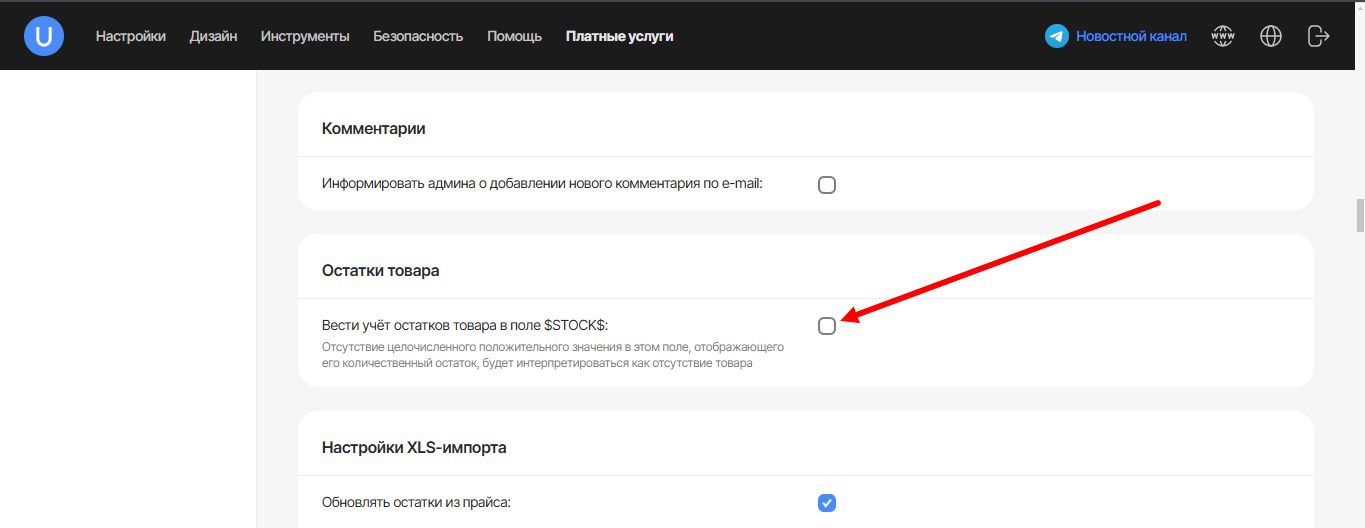 Остаток - по умолчанию выключен. Помогает отслеживать реальный остаток по складу. Активируйте склад в разделе Интернет-магазин → Дизайн и настройка магазина → Общие настройки - найдите на странице блок, поставьте галку.