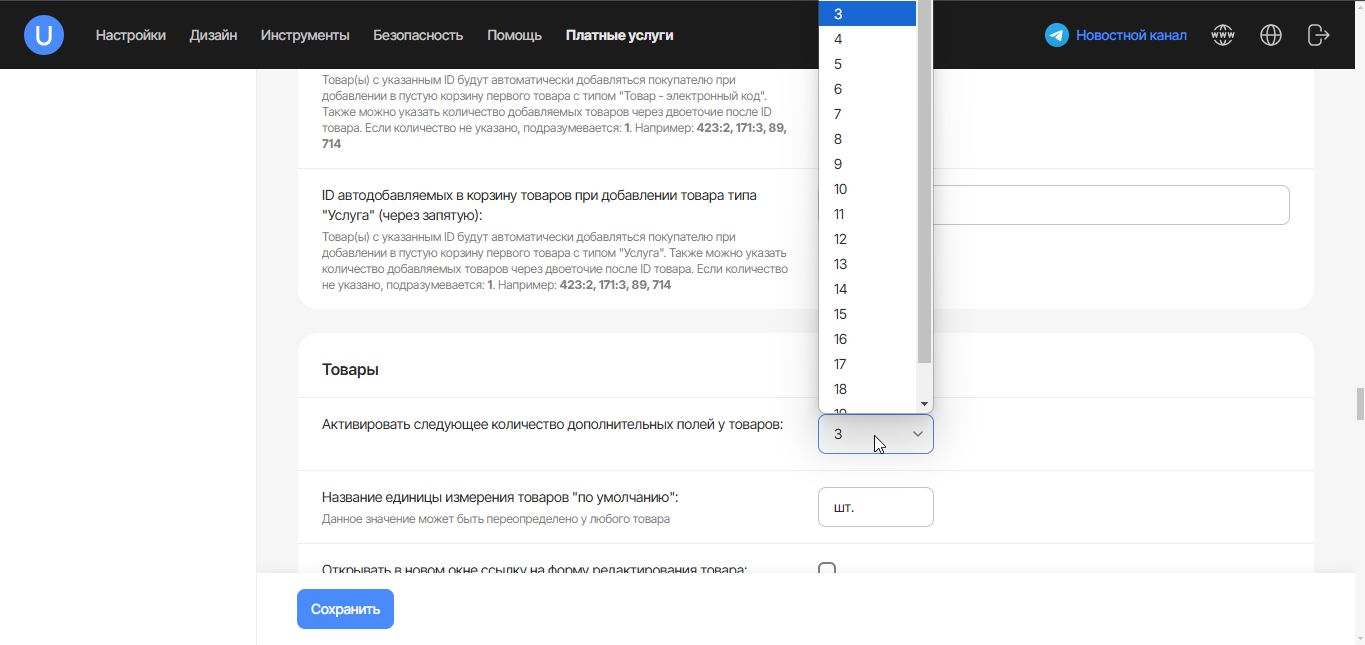 По умолчанию активировано всего 3 поля, но можно активировать больше, достаточно перейти Интернет-магазин → Дизайн и настройка магазина → Общие настройки - найдите на странице пункт Активировать следующее количество дополнительных полей у товаров, в выпадающем списке выберите необходимое вам количество полей.