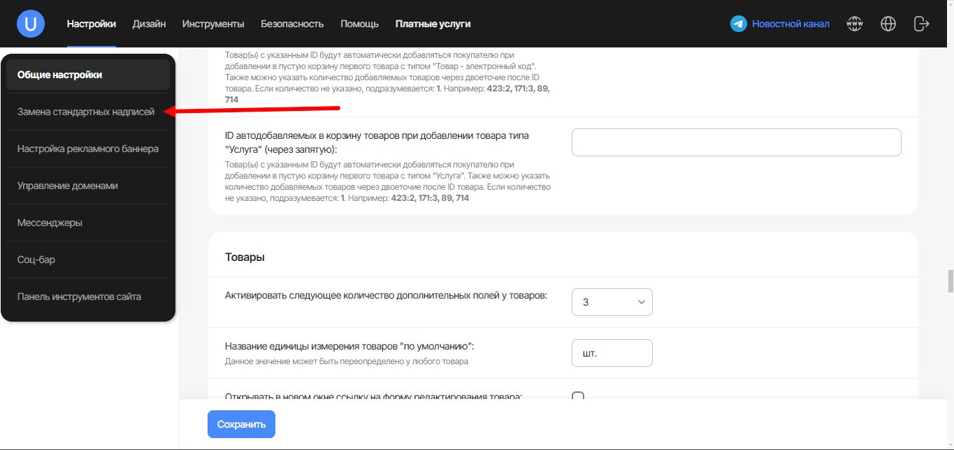 Названия дополнительных полей возможно изменить в разделе Замена стандартных надписей, Дополнительные поля товаров магазина.