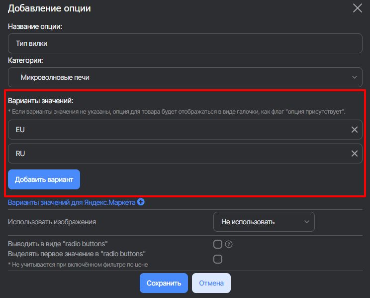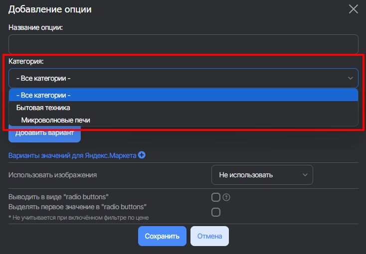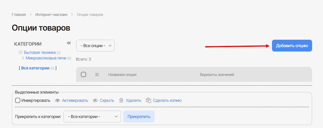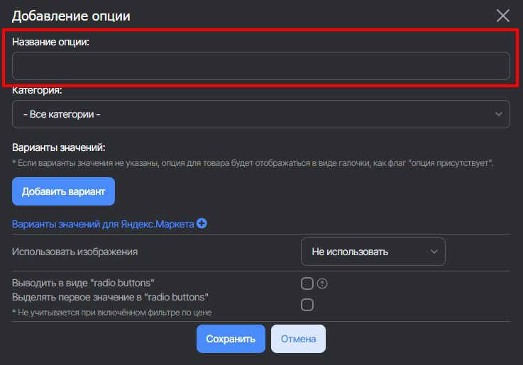 В открывшемся окне нажмите кнопку Добавить опцию. Заполните: название опции, к какой категории относится опция, добавьте значение опций.
