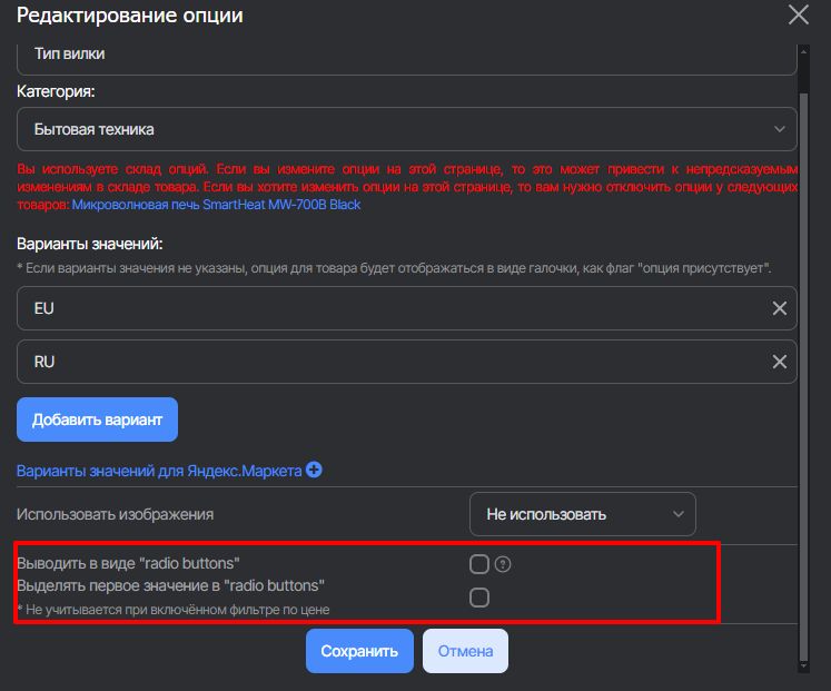 В этом же разделе при необходимости вид опций можно изменить с select на radio button. Вот эти настройки отвечают за это.