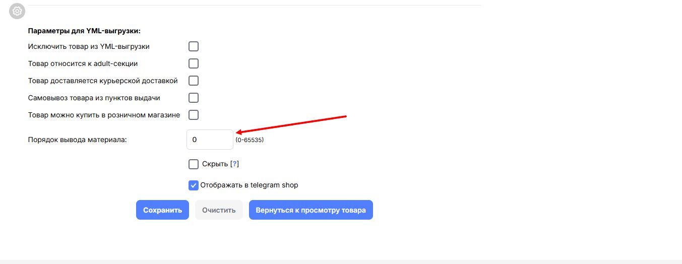 Теперь у вас на редактирования и добавления товара есть новое поле - Порядок вывода материала. Чем ниже число в этом поле - тем выше товар в списке, поддерживаются в том числе отрицательные значения, для закрепления товара.
