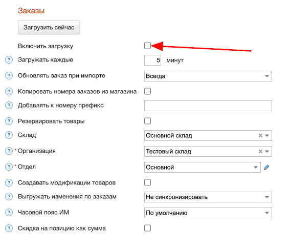 - Установите галку напротив пункта Включить загрузку в блоке Заказы.