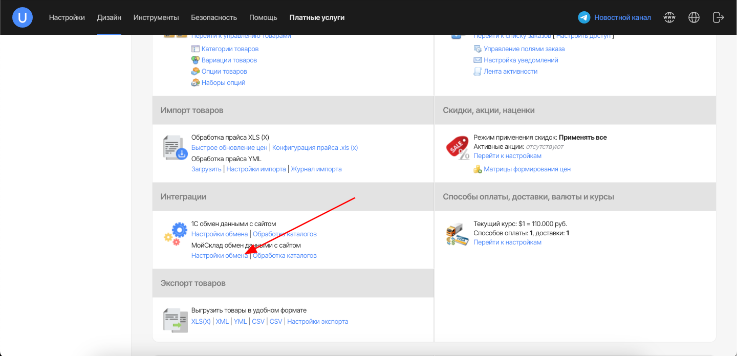 Переместитесь к блоку с интеграциями и нажмите Настройки обмена.