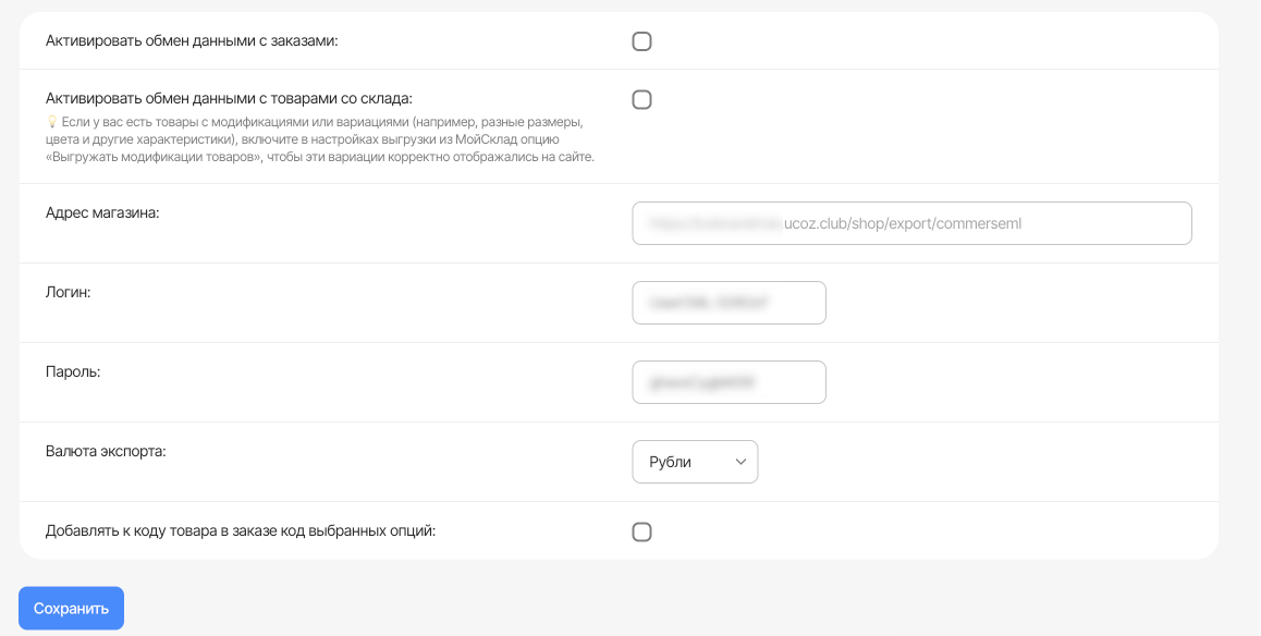 Отметьте галки Активировать обмен данными с заказами и Активировать обмен данными с товарами со склада, затем нажмите Сохранить.