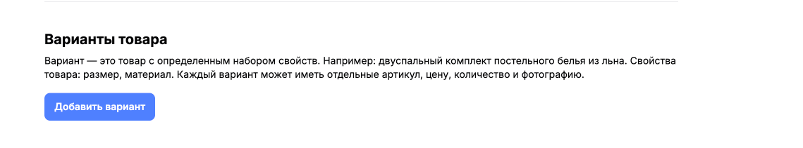 Вариации товаров — это когда один товар может быть разным. Например, одна и та же футболка бывает разного цвета или размера. У каждой вариации — свой код, свой остаток на складе и своя цена. Так проще следить за ними и продавать.