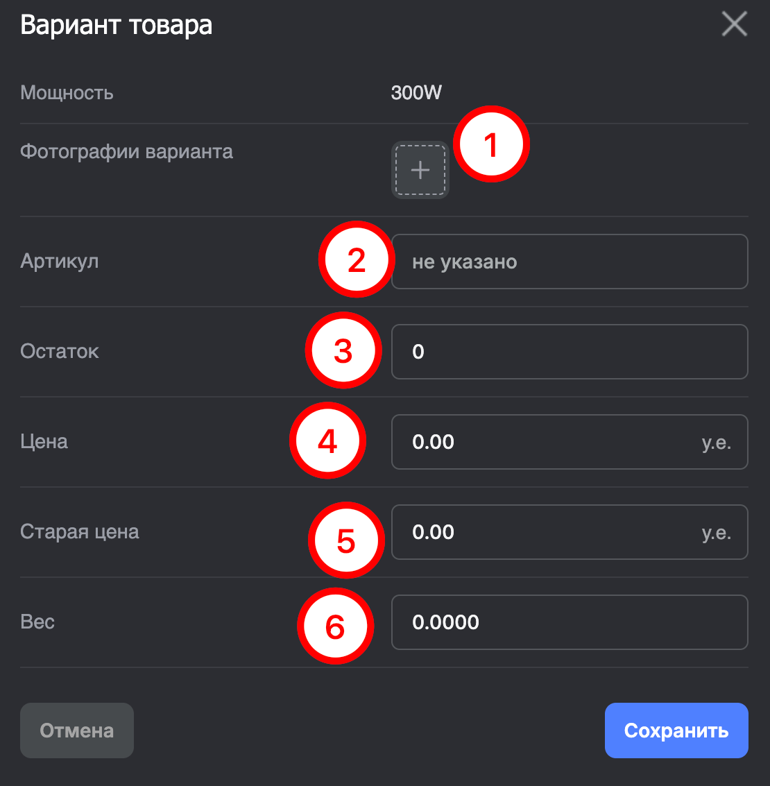 При активированных вариациях поле Цена для самого товара можно оставить пустым.