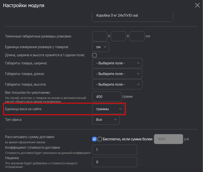 - Вес - хоть конструктор все и меряет в граммах, вы можете выбрать другую единицу в настройках системы доставки, к примеру в СДЭК.
