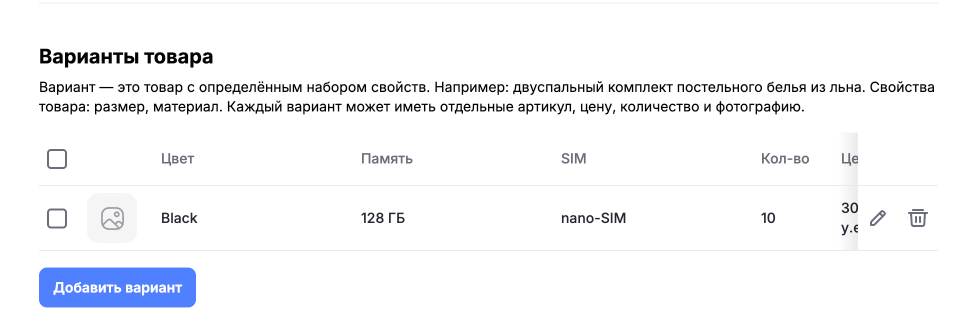 Теперь вы видите иконку карандаша у каждой из вариаций, при нажатии на любую из у у вас откроется окно редактирования вариации.