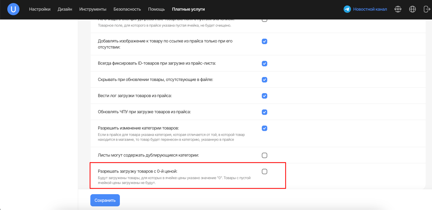 Для корректного импорта товаров с нулевой ценой, в Общих настройках модуля Интернет-магазин необходимо разрешить загрузку товаров с ценой 0.