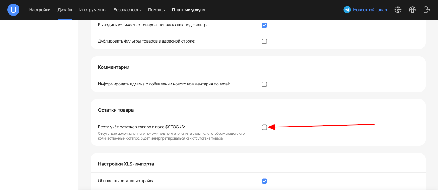Интернет-магазин → Дизайн и настройка магазина → Общие настройки