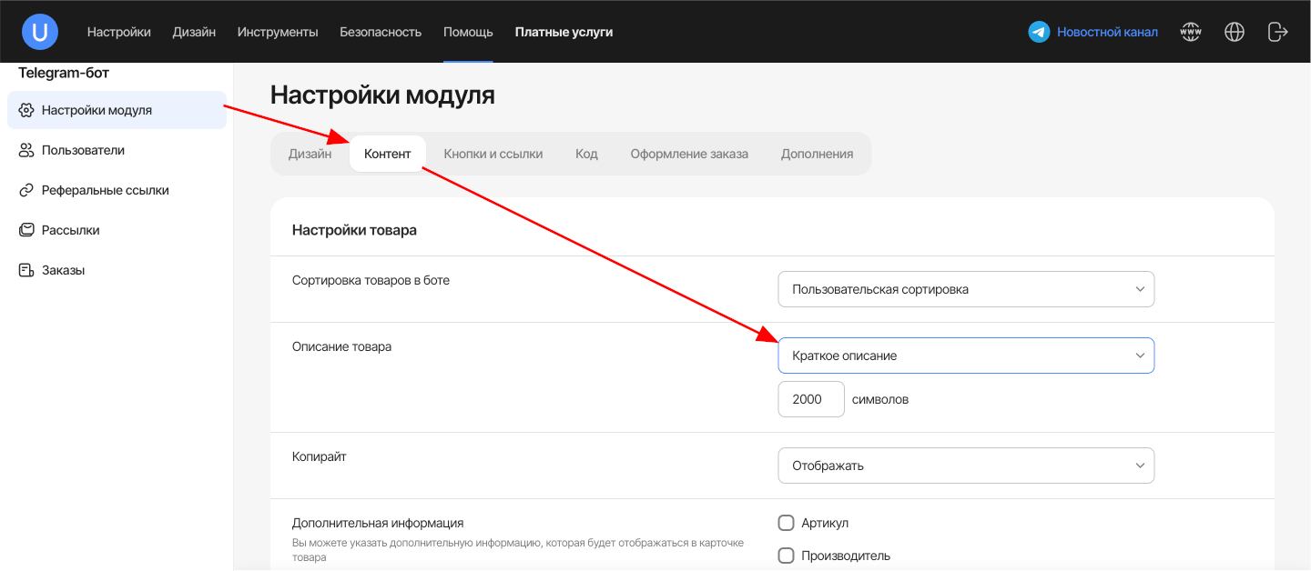 Краткое описание - в настройках модуля Telegram-бот можно выбрать в качестве основного описания.