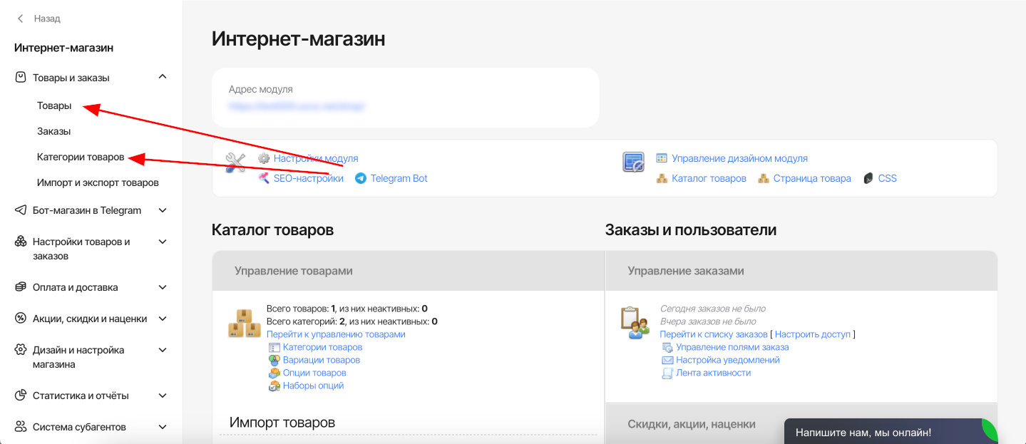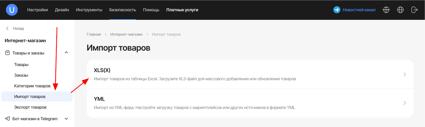Находим в левом меню Интернет-магазин → Товары и заказы → Импорт товаров