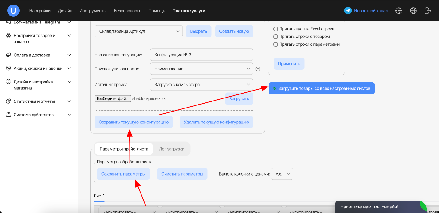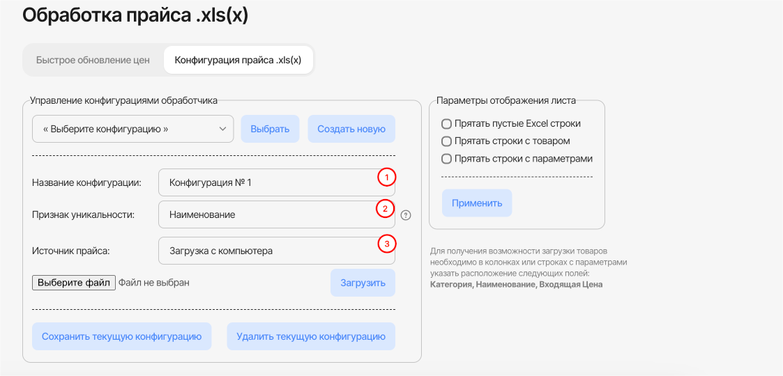 Выберите вкладку Конфигурация прайса .xls(x) и укажите: