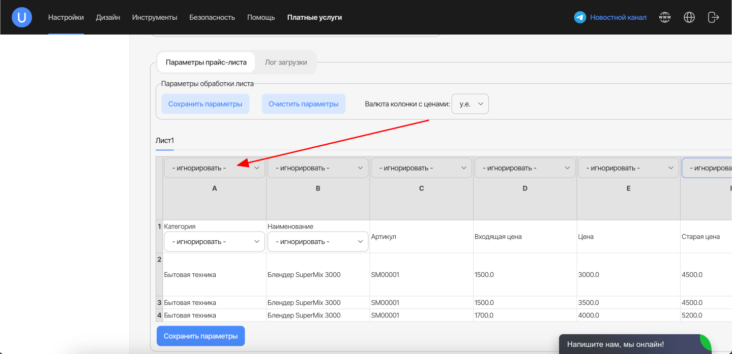 После выбора и загрузки прайс-листа у нас появится аналогичная нашему прайсу таблица, где требуется указать что конкретно в тех или иных столбцах находится - сопоставьте столбцы.